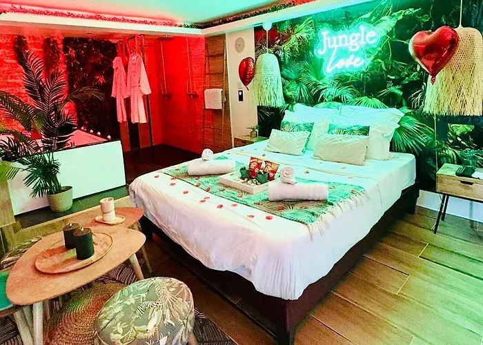 Апартаменти пропонують зручності для самостійного приготування їжі, такі як повністю обладнана кухня, є обідня зона і їдальня на відкритому повітрі для зручності гостей. Помешкання пропонує кавоварку, що забезпечує гостям зручний і приємний відпочинок. Гості можуть скуштувати страви французької кухні в ресторані O'Berge Espagnole, розташованому на відстані всього лише 5 хвилин ходьби. Аеропорт Париж Орлі розташований за 45, а автовокзал Prieure - Parc d'Entreprises - за 200 метрів від Loveroom Jungle Love Proche Disneyland Paris. До послуг гостей патіо і сад, а також тераса з видом на сад. Включення спа-салону дозволяє гостям мати більш приємний відпочинок.